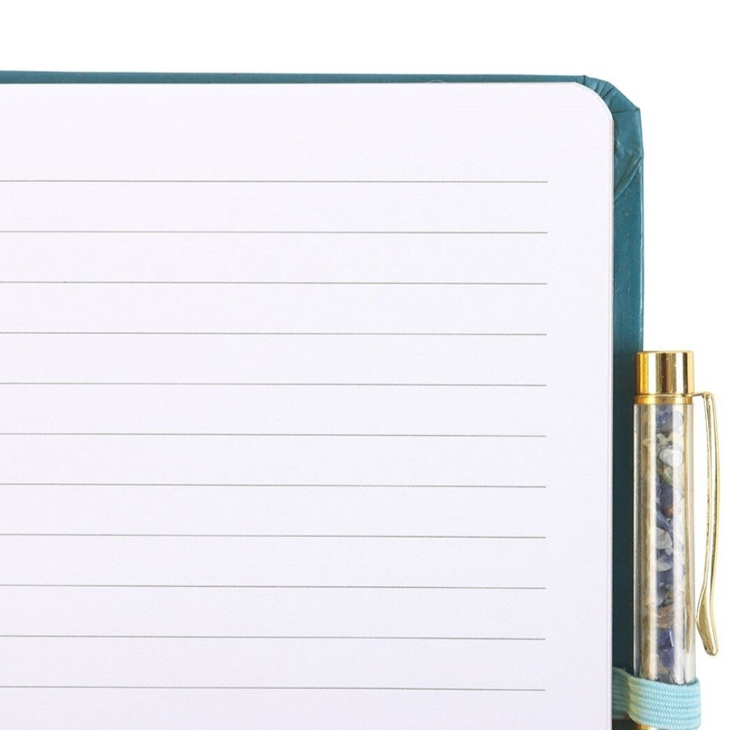De set wordt compleet gemaakt met een bijpassende Crystal Chip-pen, gevuld met kleine edelsteenachtige chips die zorgen voor een luxe en spirituele uitstraling. Ideaal voor journaling, affirmaties, dankbaarheidsmomenten of als stijlvol bureau-accessoire.